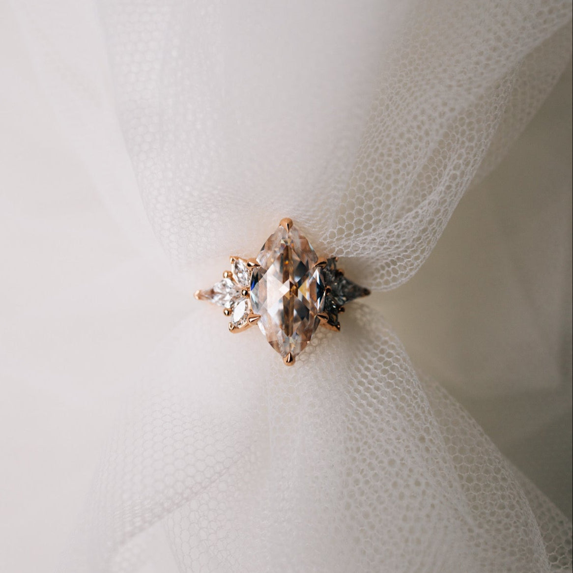 At the heart of Serena lies an approximate 3-carat duet rose cut moissanite in DEF color, cradled by six delicate claw prongs. Four petite marquise lab-grown diamonds and a pair of kite-shaped lab diamonds accent the setting, creating a harmony of symmetry and sparkle.