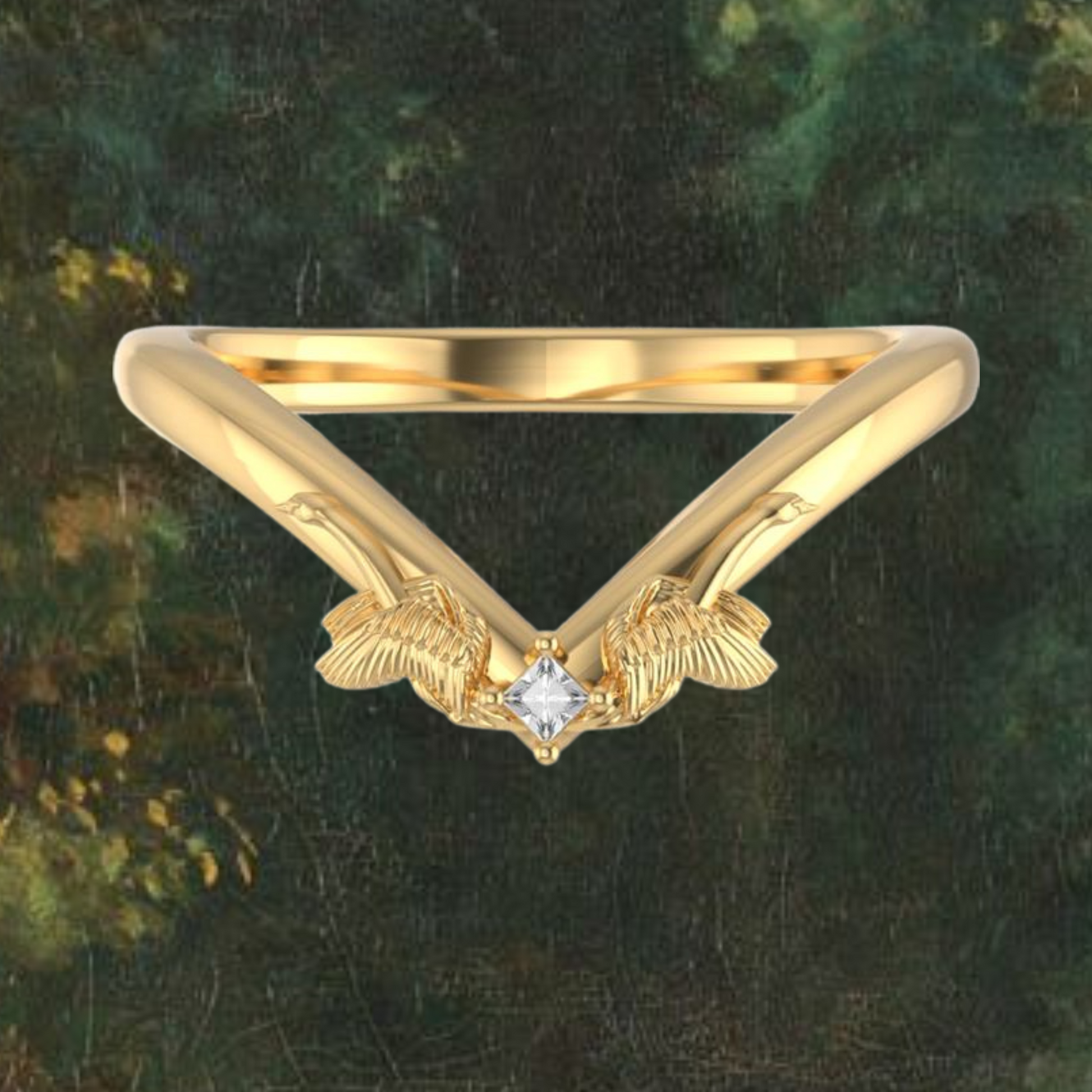 Graceful and symbolic, the Odette wedding ring is an ode to devotion, unity, and enduring love. Crafted in luminous 14k gold, the band forms a soft contoured V that cradles a single princess cut lab grown diamond at its center, a quiet moment of brilliance meant to be worn every day.