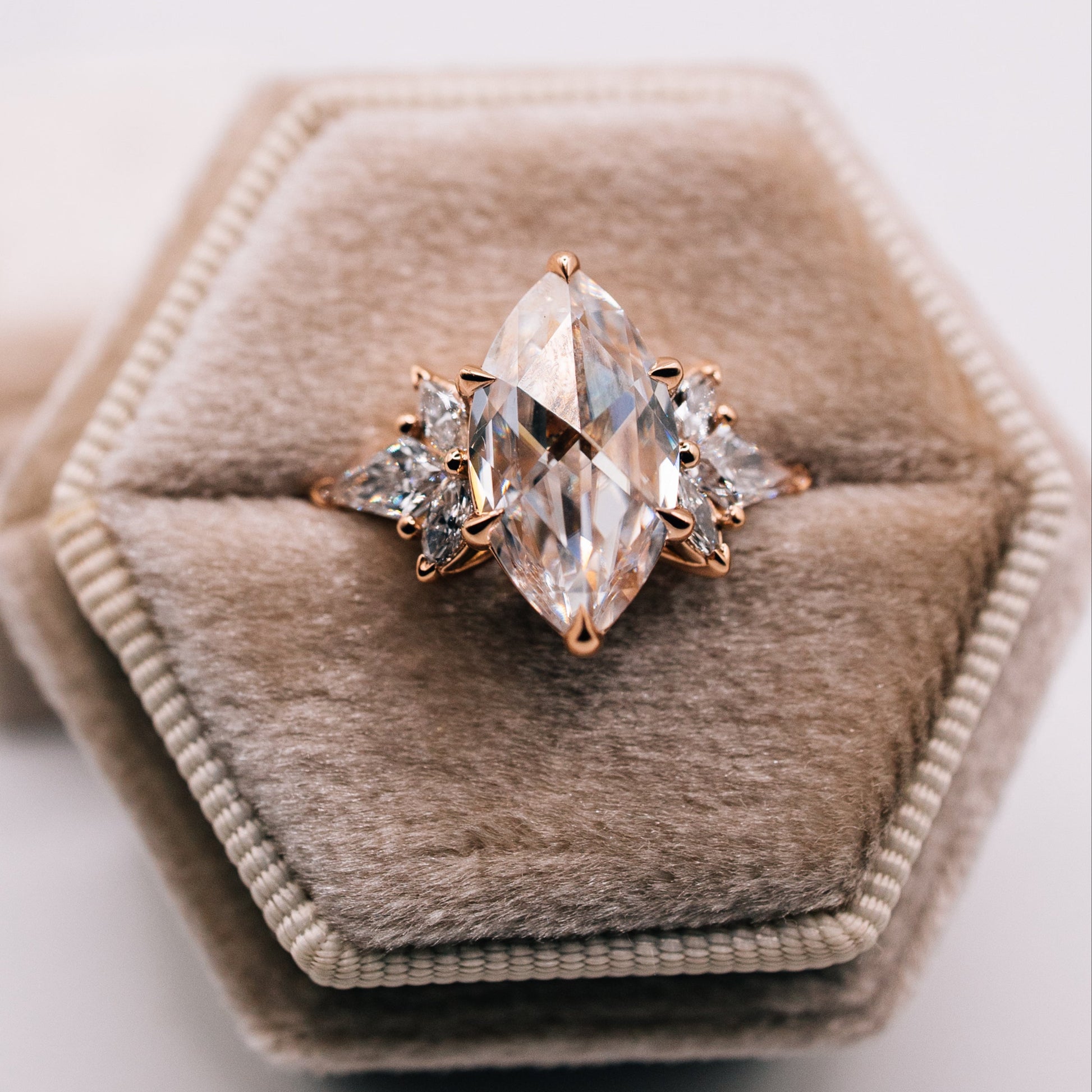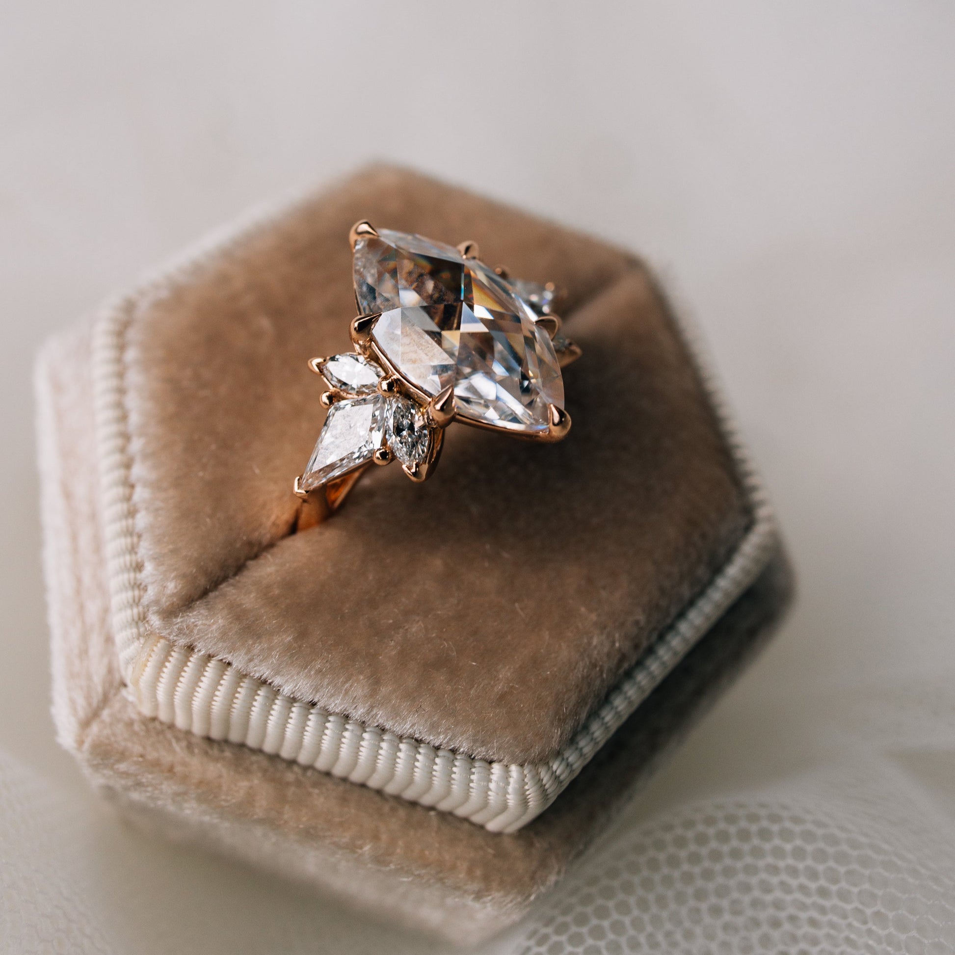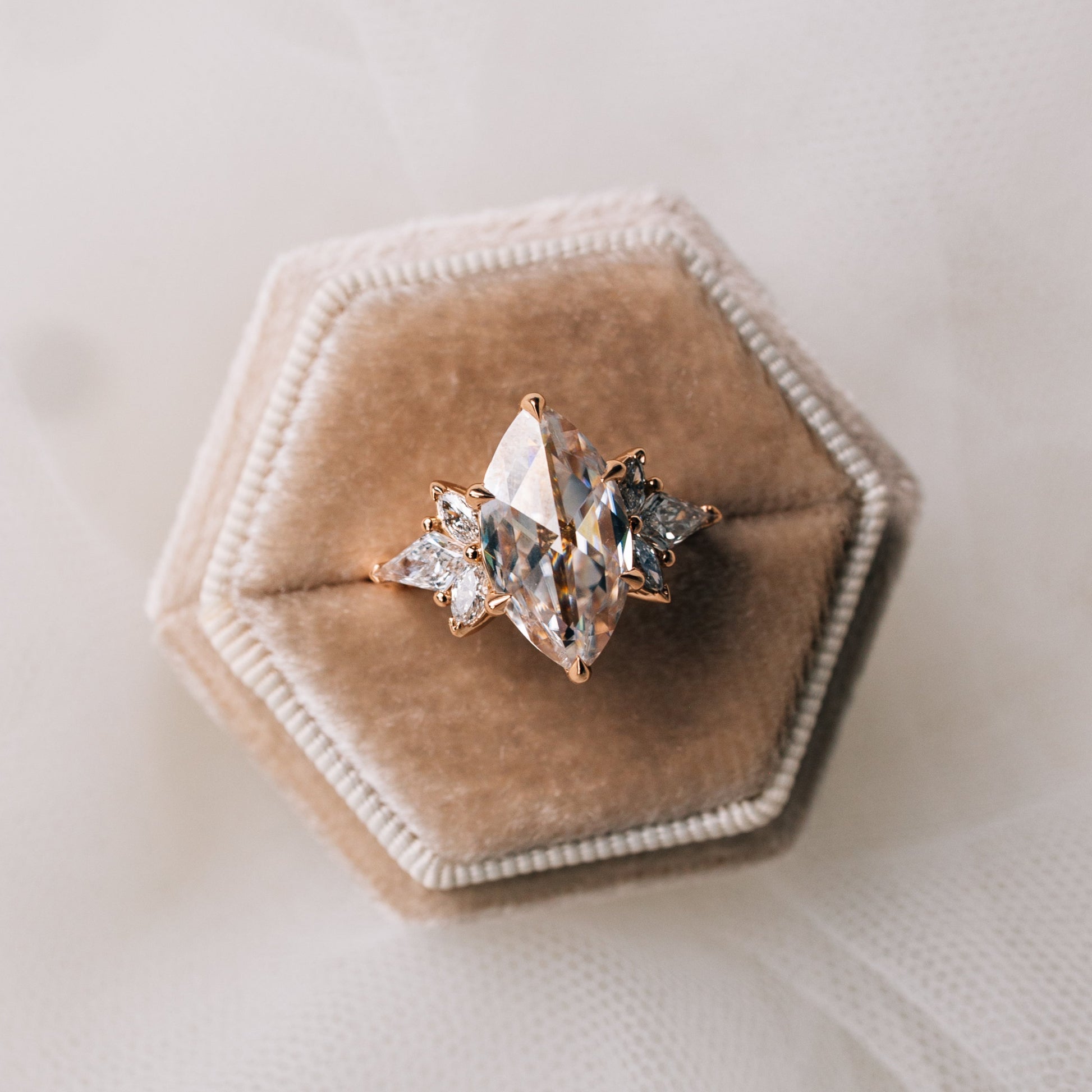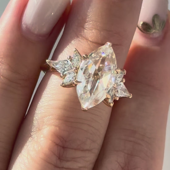 At the heart of Serena lies an approximate 3-carat duet rose cut moissanite in DEF color, cradled by six delicate claw prongs. Four petite marquise lab-grown diamonds and a pair of kite-shaped lab diamonds accent the setting, creating a harmony of symmetry and sparkle.